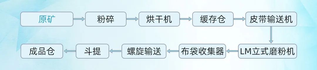 該法是將膨潤土原礦首先經過破碎,破碎后小于20mm的原料進入烘干機系統進行烘干,烘干后的物料進入緩存倉儲存,然后經過皮帶輸送機送入立式磨粉機加工成100-325目級別的產品,后經螺旋輸送、斗提設備后進入成品倉儲存。