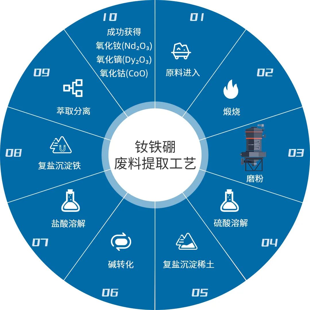 隨著釹鐵硼磁體在新能源汽車、風力發電、醫療設備等領域廣泛應用,釹鐵硼廢料的產量逐漸增加。而工信部發布的《稀土管理條例》征求意見稿中明確指出,要鼓勵以綠色環保技術對含有稀土的二次資源進行回收利用。