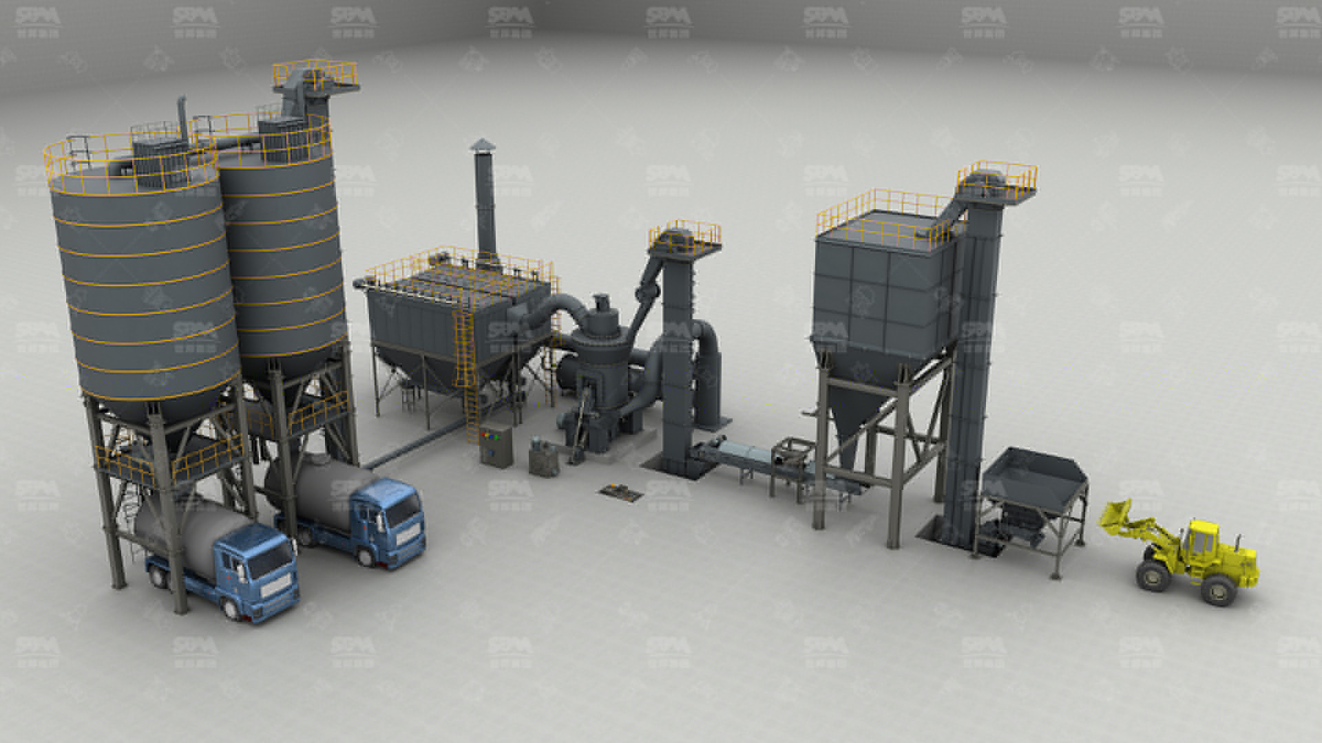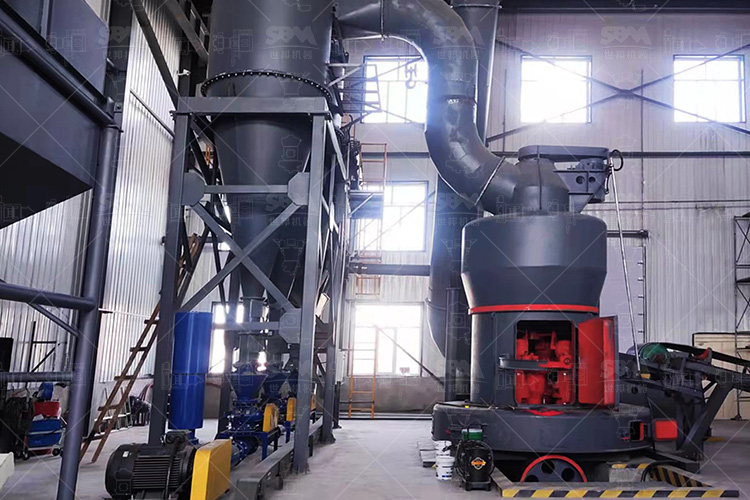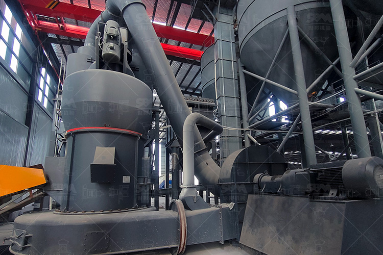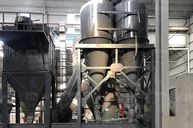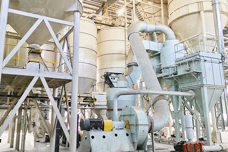 原料經(jīng)變頻皮帶給料機均勻定量連續(xù)地送入主機磨室內(nèi)進行研磨。粉磨后的物料被風機氣流送入選粉機進行分級,在分析機的作用下,不符合細度要求的物料落入磨室內(nèi)重新碾磨,合格的物料則隨氣流經(jīng)管道進入旋風集粉器內(nèi),進行分離收集,經(jīng)排料裝置排出即為成品粉體。分離后的氣流通過旋風集粉器上端回風管進入風機。該生產(chǎn)系統(tǒng)在負壓密閉條件下運行,并配有脈沖除塵器無粉塵外溢,符合國家環(huán)保標準。