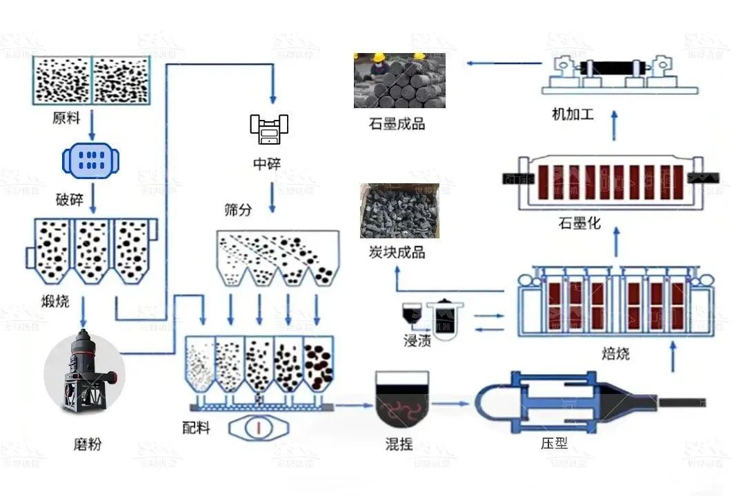 碳素生產(chǎn)流程:以石油焦、針狀焦為原料,煤瀝青為黏結(jié)劑。經(jīng)過原料煅燒、破碎磨粉、配料、混捏、成型為生坯,焙燒固化得到炭塊。